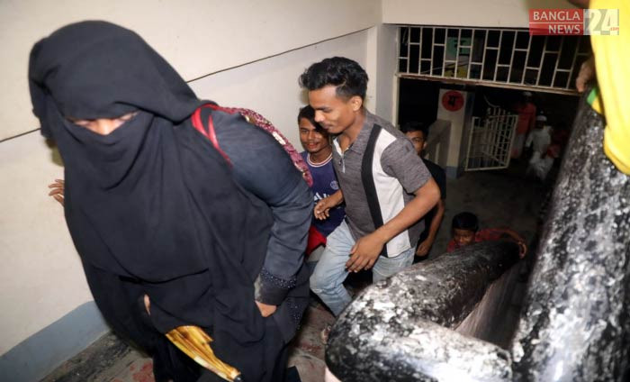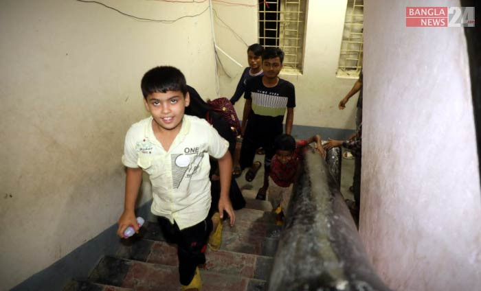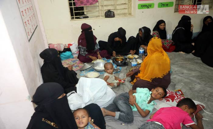 ঘূর্ণিঝড় মোখার হাত থেকে রক্ষা পেতে শাহপরীর দ্বীপের উত্তর পাড়া সরকারি প্রাথমিক বিদ্যালয় আশ্রয়কেন্দ্রে রাত ১১টার দিকে আশ্রয় নিতে আসেন কয়েকটি পরিবার। ছবি: উজ্জ্বল ধর