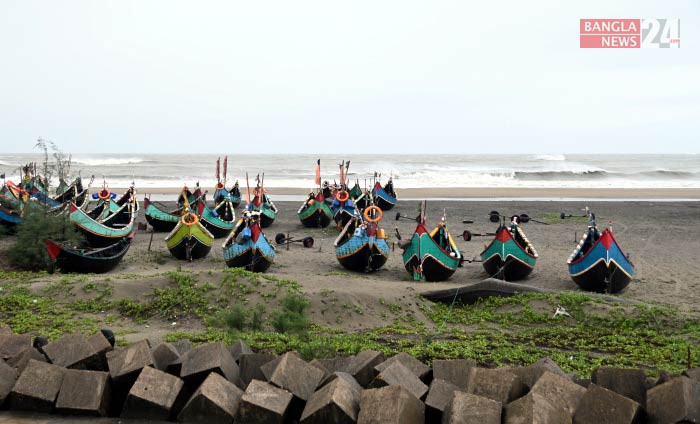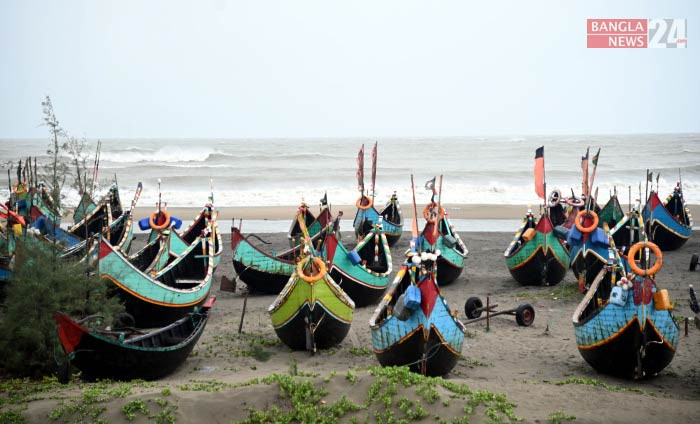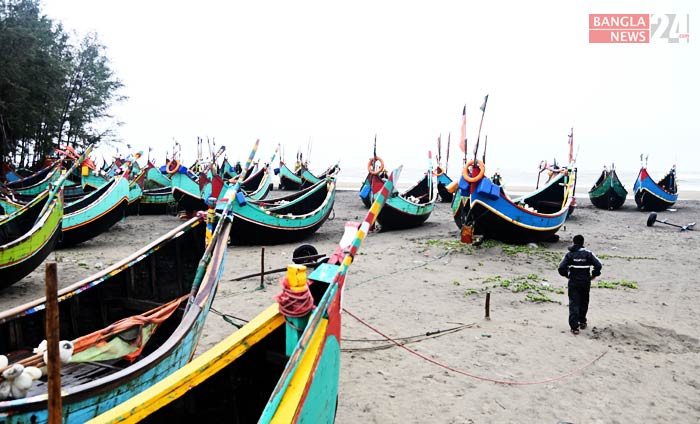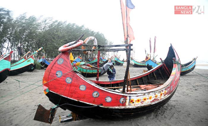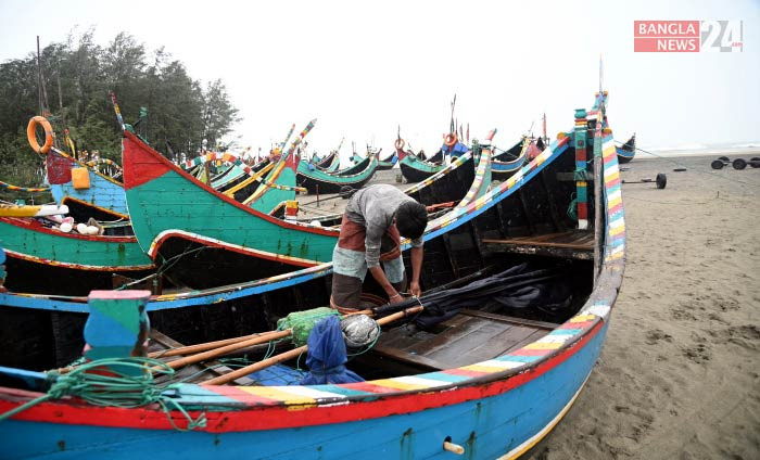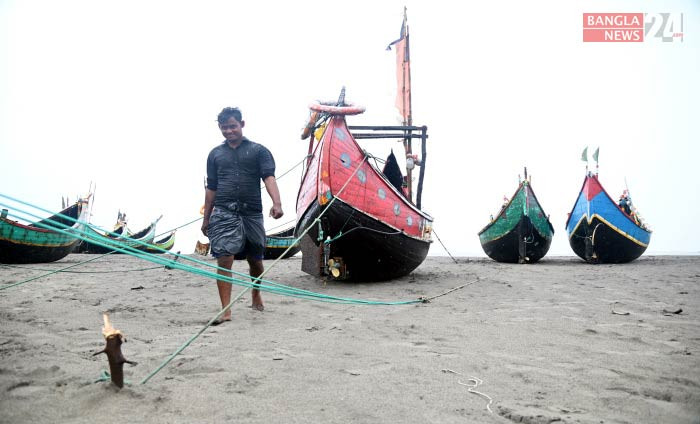 নিজেদের নৌকা নিরাপদে রাখার চেষ্টা করেছেন টেকনাফের শাহপরী দ্বীপের জেলেরা। ছবি: উজ্জ্বল ধর