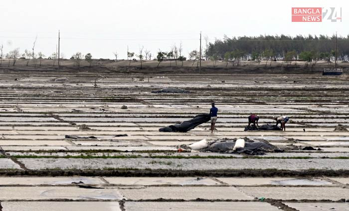 জোয়ার আসতেই পানি ডুকতে শুরু করেছে টেকনাফের শাহপরীদ্বীপের লবন মাঠে। লবন রক্ষার শেষ চেষ্টা করছেন চাষীরা। ছবি: উজ্জ্বল ধর
