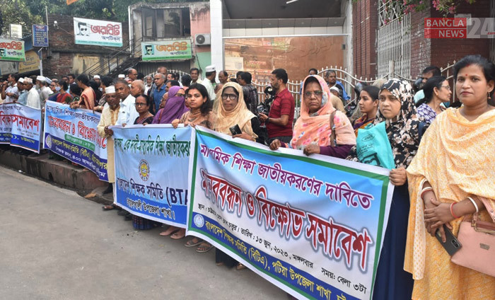 মাধ্যমিক শিক্ষা জাতীয়করণের দাবিতে মঙ্গলবার বিকেলে চট্টগ্রাম প্রেসক্লাবের সামনে মানববন্ধন ও সমাবেশ করে বেসরকারি মাধ্যমিক স্কুলের শিক্ষকরা। ছবি: উজ্জ্বল ধর