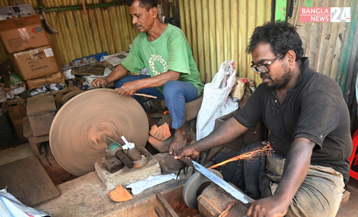 কোরবানির পশু জবাই-কাটাছেঁড়া করতে দা-ছুরি-কিরিচ ধারানোর কাজে ব্যস্ত চট্টগ্রামের জেলরোড এলাকার শানের দোকানগুলো, ছবি: উজ্জ্বল ধর