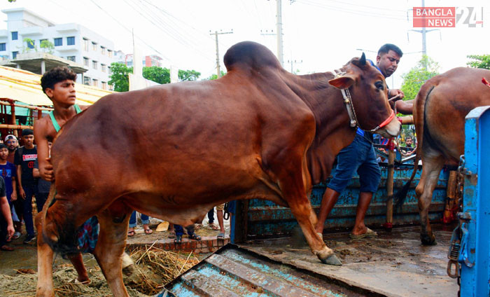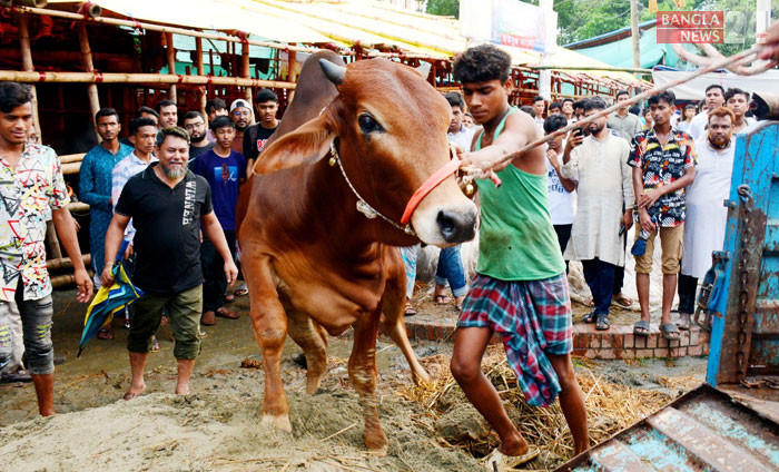 পশুর হাটে বিক্রির জন্য আনা হচ্ছে কোরবানির গরু। ছবি: শোয়েব মিথুন