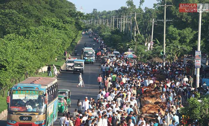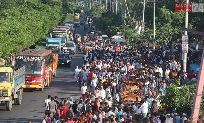 ঢাকা-চট্টগ্রাম মহাসড়কের ফেনীর মোহাম্মদ আলী বাজার এলাকায় মহাসড়ক দখল করে চলছে কোরবানির পশুর হাট। ছবি: বাংলানিউজ
