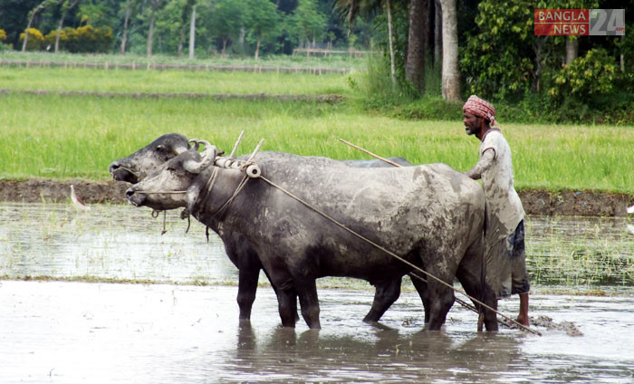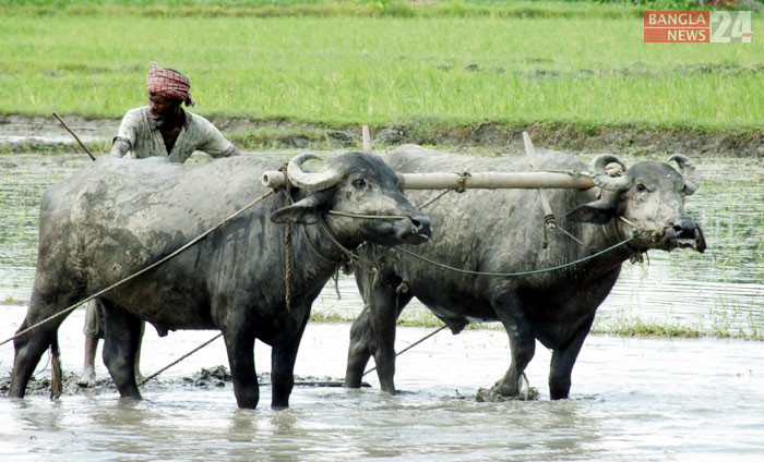 জোড়া মহিষ আর মই দিয়ে জমি সমান্তরাল করছেন কৃষক। ঈশ্বরদীর মুলাডুলি ইউনিয়নের বাঘহাছলা গ্রাম থেকে ছবি তুলেছেন টিপু সুলতান