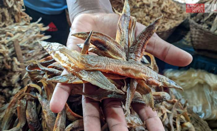 বিক্রেতার হাতে বাইম-শুঁটকি। ছবি: বাংলানিউজ