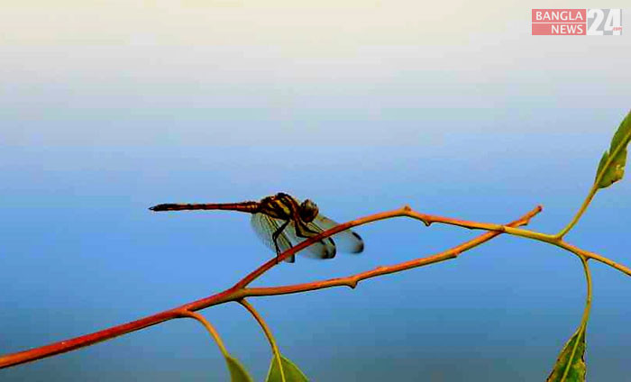 গাছের ডালে বসে আছে ফড়িং। সিলেটের শাহজালাল উপশহর থেকে ছবি তুলেছেন মাহমুদ হোসেন