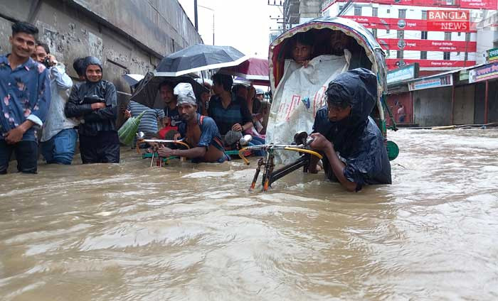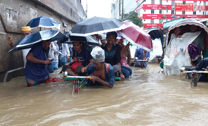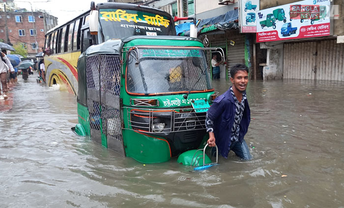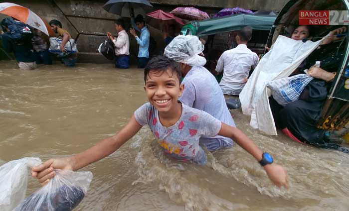 টানা বর্ষণে তলিয়ে গেছে চট্টগ্রামের অধিকাংশ এলাকা, নালা ও খালের নোংরা বিষাক্ত কালো পানি মাড়িয়ে চলাচল করছেন পথচারীরা। ছবি: উজ্জ্বল ধর