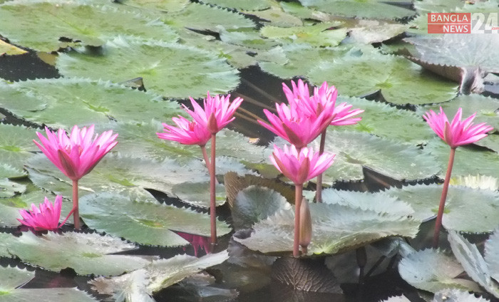 ফুটে আছে লাল শাপলা। পশ্চিমাঞ্চল রেলওয়ের পাকশী সদরদপ্তরের রেলওয়ে ব্যবস্থাপকের কার্যালয়ের সামনে থেকে ছবিটি তুলেছেন টিপু সুলতান