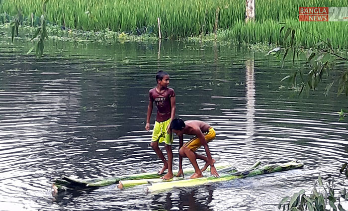 বিলে কলাগাছের ভেলা ভাসিয়ে আনন্দে মাতোয়ারা সৈয়দপুরের কামারপুকুরের দুই কিশোর। ছবি: আমিরুজ্জামান