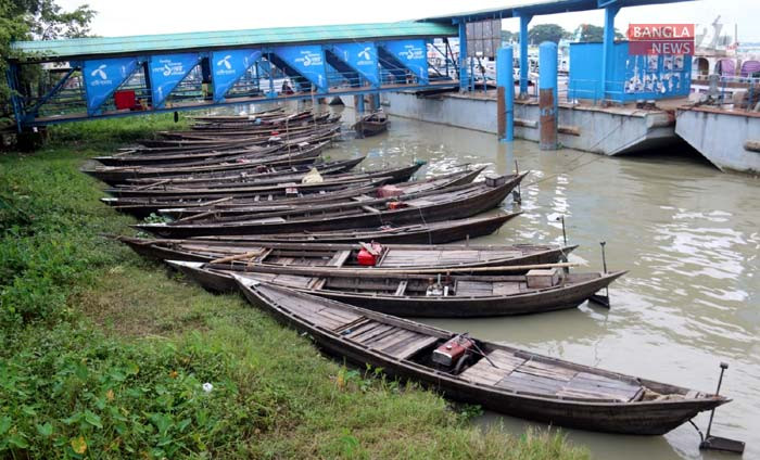 প্রজনন মৌসুমে নিষেধাজ্ঞা অমান্য করে ইলিশ শিকারের সময় জব্দ হওয়া ইঞ্জিন চালিত নৌকা সারিবদ্ধভাবে রাখা হয়েছে কীর্তনখোলা নদীর তীরে। ছবি তুলেছেন এন আমিন রাসেল।