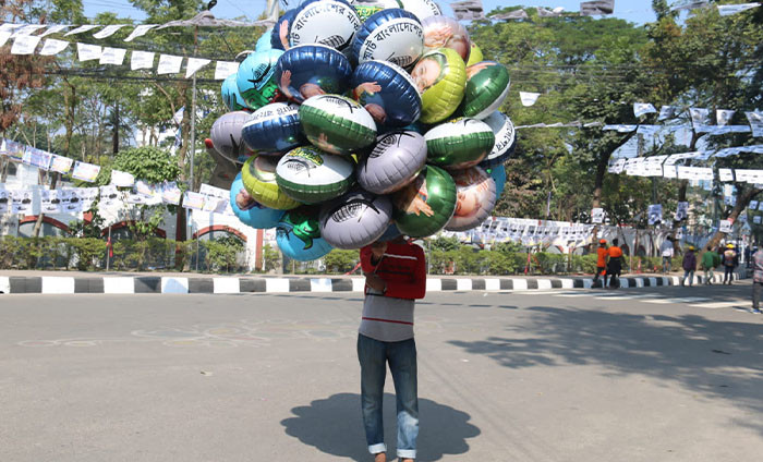 বরিশালে নৌকার ছবি যুক্ত বেলুন বিক্রি করতে সমাবেশমুখী সড়কে দাঁড়িয়ে ক্ষুদ্র ব্যবসায়ী। ছবি: এন আমিন রাসেল।