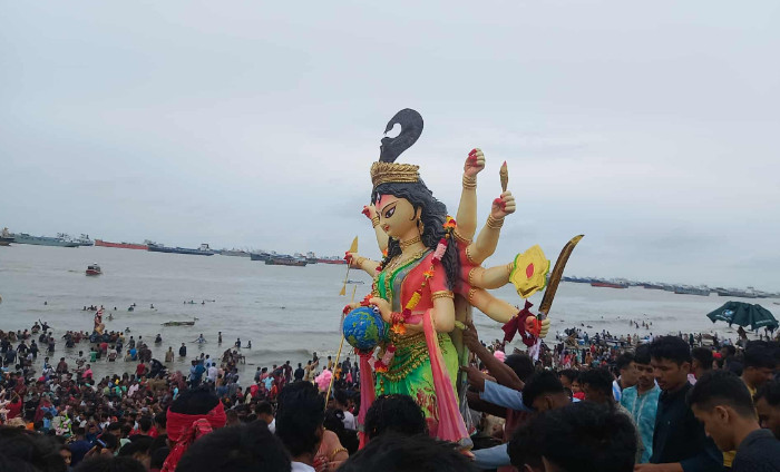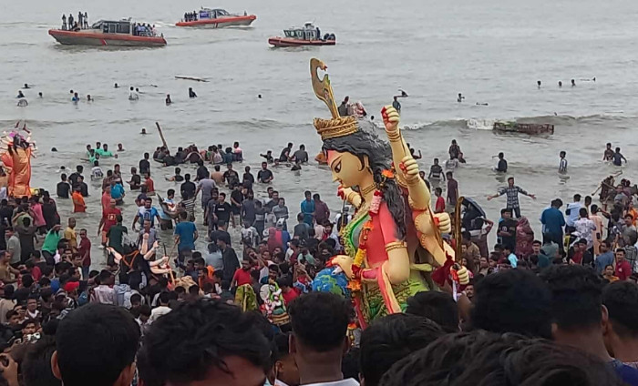 প্রতিমা বিসর্জনের মধ্য দিয়ে সমাপ্তি হলো শারদীয় দুর্গোৎসবের। চট্টগ্রামের পতেঙ্গা সমুদ্রসৈকতে প্রতিমা বিসর্জন করা হচ্ছে/ছবি: সোহেল সরওয়ার