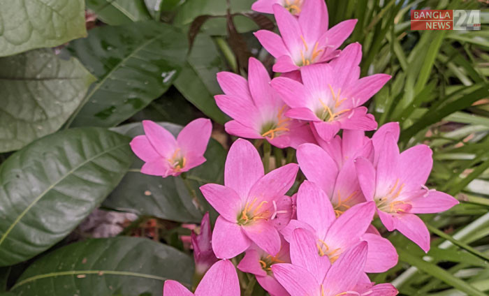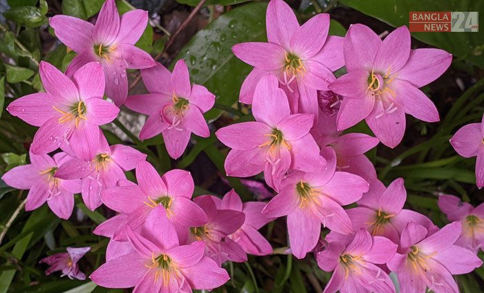 বৃষ্টির ছোঁয়ায় ফুটে ওঠা এক থোকা গোলাপি রেইন লিলি। ছবি : বিশ্বজিৎ ভট্টাচার্য বাপন