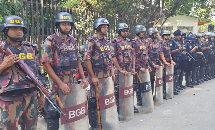 গুম-খুন এবং মানবতাবিরোধী অপরাধের মামলায় সেনা কর্মকর্তাদের বুধবার আন্তর্জাতিক অপরাধ ট্রাইব্যুনালে আনার সময় নিরাপত্তা জোরদার করা হয়। ছবি: জিএম মুজিবুর